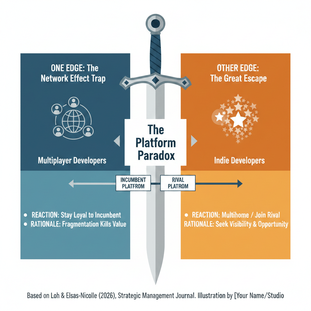 Dominance is a “double-edged sword.” A large, unified platform maximizes indirect network effects, giving partners access to the widest possible audience. But that same success attracts a flood of other partners, leading to hyper-competition. When a new rival enters the market, partners face a fundamental tension: do they stay with the incumbent to protect their network benefits, or join the newcomer to escape the crowd?